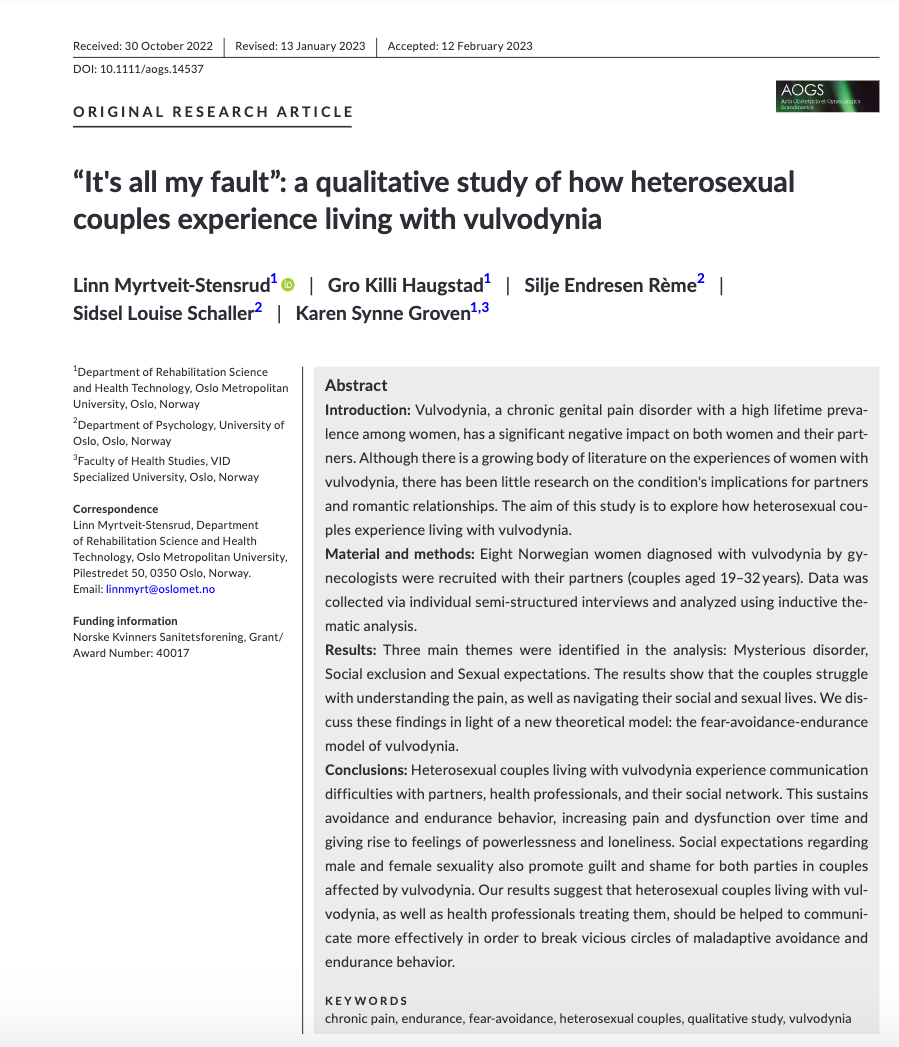 Den første artikkelen i doktorgraden min undersøkte hvordan heterofile par erfarer å leve med vulvodyni. Vi fant ut at smertedebut, erfaringer med helsevesenet, kulturelle forventninger og partner kan påvirke hvordan kvinner mestrer vulvasmertene sine. Hele artikkelen kan du lese her.